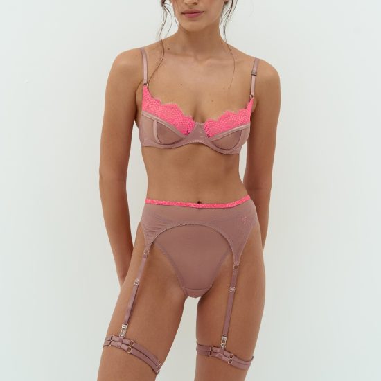 Занурся у світ елегантності та спокуси з нашим ексклюзивним комплектом білизни Santa. Яскраве червоне мереживо в поєднанні з ніжною нюдовою сіткою створює ідеальний баланс між пристрастю та витонченістю. У комплект входить бюстгальтер на кісточках, високі трусики з чуттєвими вирізами та вишуканий пояс для панчіх з регульованими бретелями. Вишукані мереживні деталі додають розкоші, а продуманий крій підкреслює природні лінії тіла. Створений для особливих моментів, цей комплект поєднує красу, комфорт і впевненість