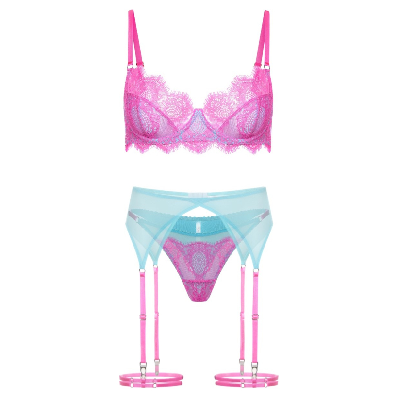 Cristallo – це мікс кольору, стилю та впевненості. Унікальне поєднання яскравого неоново-рожевого мережива з небесно-блакитною сіточкою створює ефектний контраст, що миттєво притягує погляд. Бретелі в тон додають легкості та гармонії, підкреслюючи сміливий характер цього дизайну. Комплект складається з бюстгальтера, пояса для панчіх, підв’язок та трьох варіантів трусиків на вибір — для настрою, для комфорту, для себе. Це більше, ніж білизна — це прояв свободи та індивідуальності