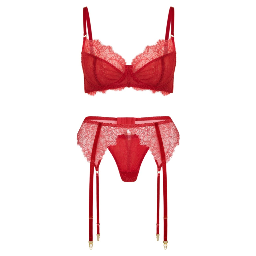 Вишуканий пристрасно-червоний мереживний комплект спідньої жіночої білизни Red Art, захопливий та витончений, створений, щоб захоплювати. Виготовлений із делікатного мережива, бюстгальтер із кісточками має елегантне оздоблення та ідеально підкреслює природні вигини тіла. У поєднанні з мереживними трусиками, поясом для панчіх та підтяжками, цей комплект випромінює впевненість, чуттєвість і привабливість. Ідеальний вибір для особливих моментів — або щоразу, коли хочеться почуватися незабутньо
