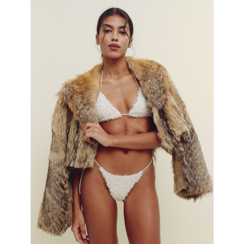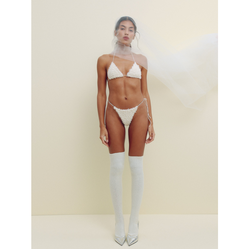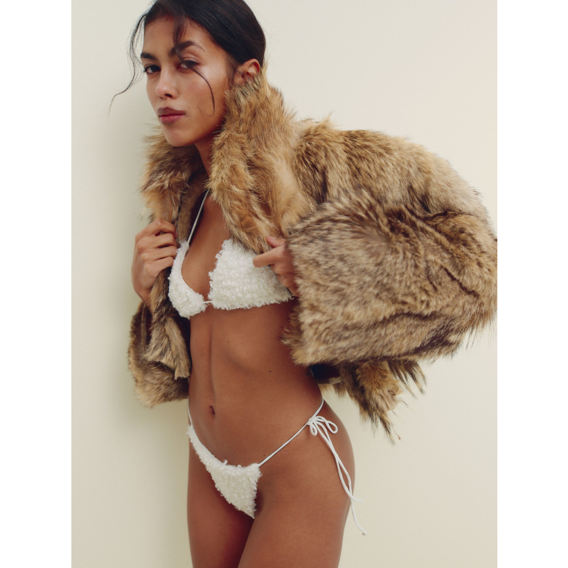 Купальник плавки Apres Ski Bikini створений для зимових відпочинків, коли день на схилах завершується теплом і розслабленням. Ідеальний для джакузі під відкритим небом або спа після катання на лижах — моментів, коли тіло нарешті відпочиває, а навколо тихо падають сніжинки. М’яка плюшева тканина з ефектом teddy огортає комфортом, а мінімалістичний крій на тонких зав’язках підкреслює природну чуттєвість. Цей купальник — поєднання контрастів: засніжені схили й гаряча пара, спокій і спокуса, cozy і bold в одному образі. Додавай топ Apres Ski щоб стилізувати повний комплект.