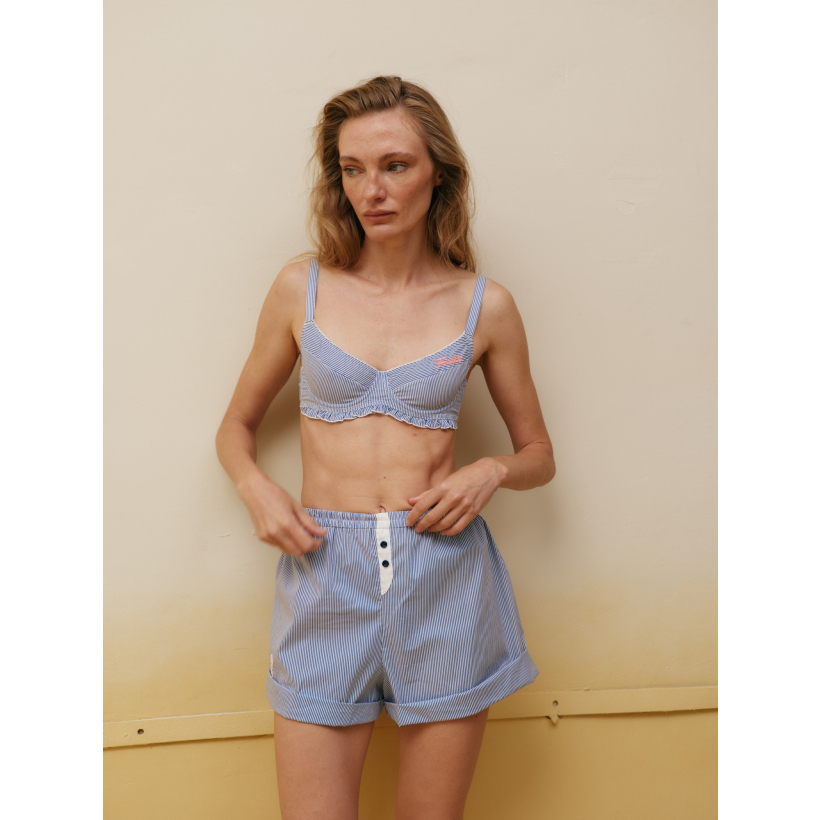 Шортики Sky Fault виконані з легкої сорочкової бавовни у синьо-білу смужку. Вільний силует і м’яка тканина дарують відчуття легкості та комфорту. Завдяки універсальному дизайну шортики зручно носити як частину комплекту з бюстгальтером і стрінгами, так і окремо — вдома чи в поєднанні з oversize сорочкою для більш розслабленого образу.