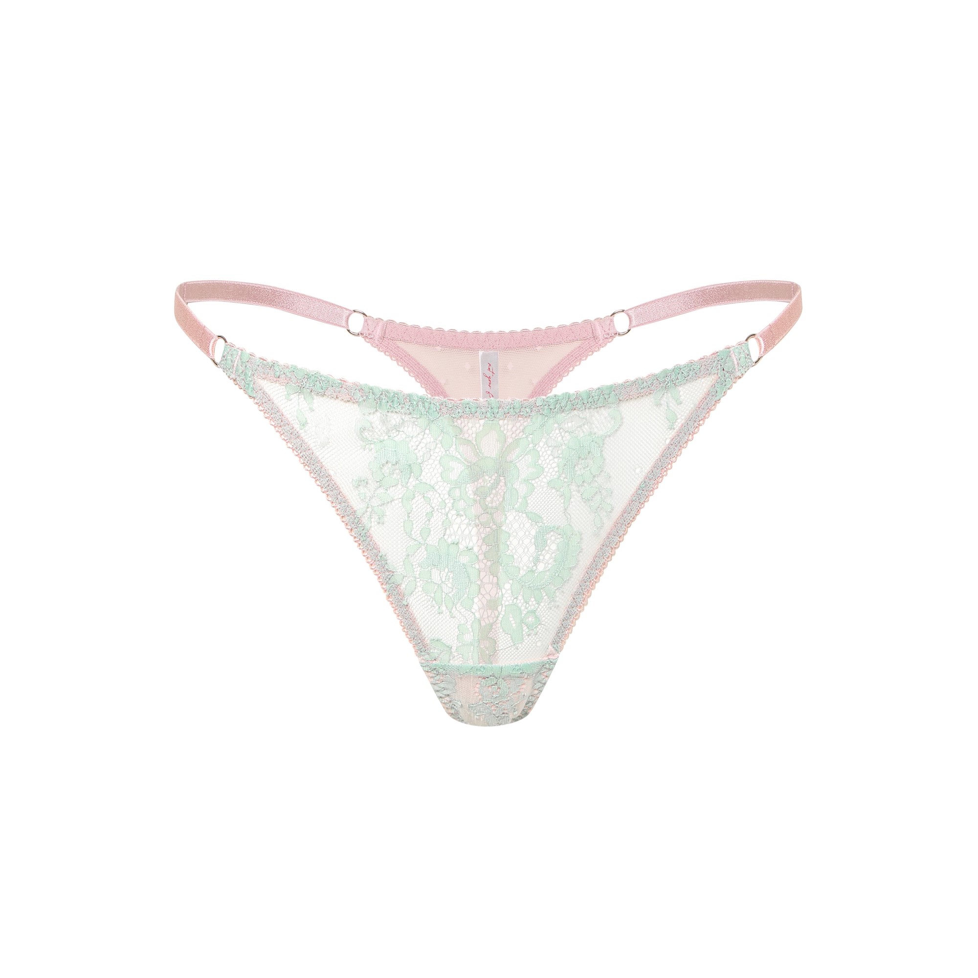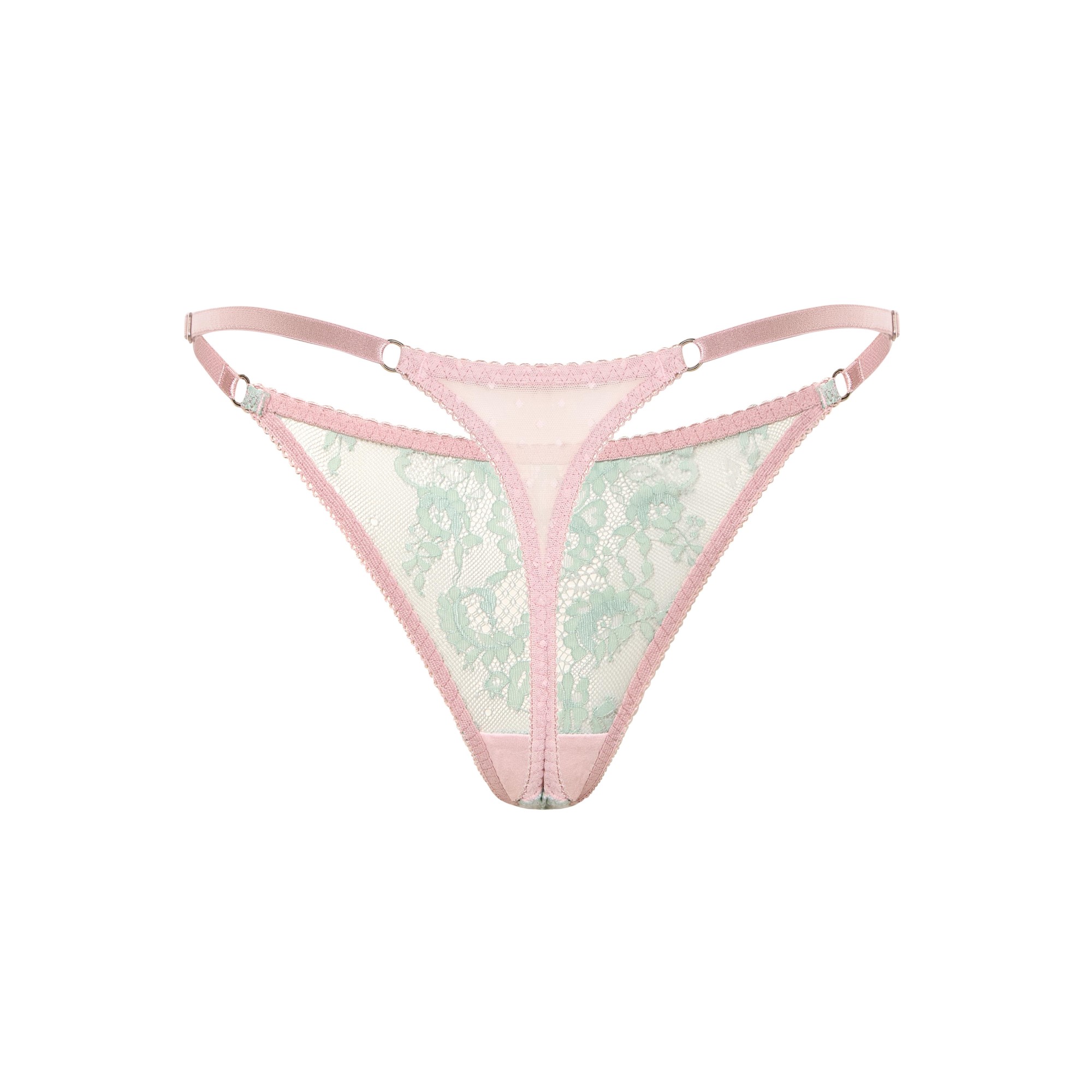 Lime Thong – ніжні мереживні стрінги у м’ятно-рожевій гамі, що поєднують свіжість кольору та витонченість форми. Напівпрозоре мереживо з квітковим візерунком додає легкості й делікатної жіночності, а тонкі регульовані бретелі забезпечують ідеальну посадку. Еластична тканина м’яко прилягає до тіла, даруючи комфорт і свободу рухів. Ідеальні як для щоденного носіння, так і для особливих моментів, коли хочеться відчути себе впевненою й бездоганною.