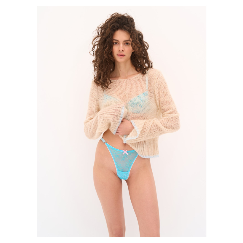 Aquamarine — це грайливі та водночас ніжні трусики танга, створені для тих, хто любить поєднання яскравості та делікатності. Модель виконана з бірюзового мережива з флористичним візерунком, яке м’яко підкреслює силует і додає образу свіжості.